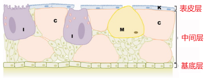 斑马鱼的皮肤结构(K:角质形成细胞;M:黏液细胞;C:杯状细胞;I:离子细胞)