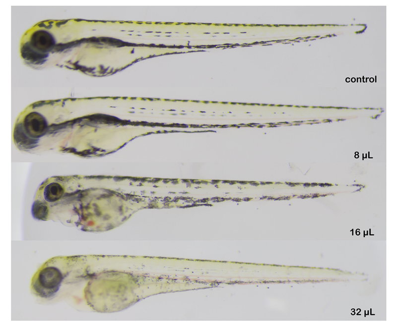 斑马鱼的胚胎透明、柔软,使外源物质的吸收容易,暴露方式简单,外源物质可直接溶于培养水体或注射至胚胎中。同时,斑马鱼胚胎具有较强的生物敏感性,毒性物质易使其致畸或死亡,且不同致畸部位的敏感性不同。因此,斑马鱼以其独特的优势已经越来越多地用于动植物提取物、抗菌剂、防晒剂以及纳米粒子等化妆品成分安全性的评价中。