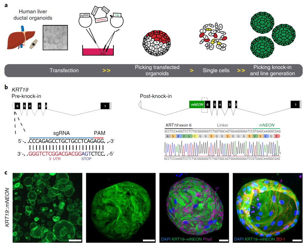 Biology杂志上发表文章,利用非同源依赖的CRISR-Cas9技术快速高效地对人源类器官进行基因敲入(CRISPR–HOT),为人源类器官的内源基因敲入提供了重要的工具平台。通过让癌基因TP53失去功能,发现异常肝细胞的非结构化分裂更为频繁。使用CRISPR-HOT将荧光标记插入人类类器官的DNA中,建立了人肝脏导管类器官的报告基因品系,可以利用活体成像、切片染色等方式可视化观察内源表达的基因表达模式以及动态变化过程。